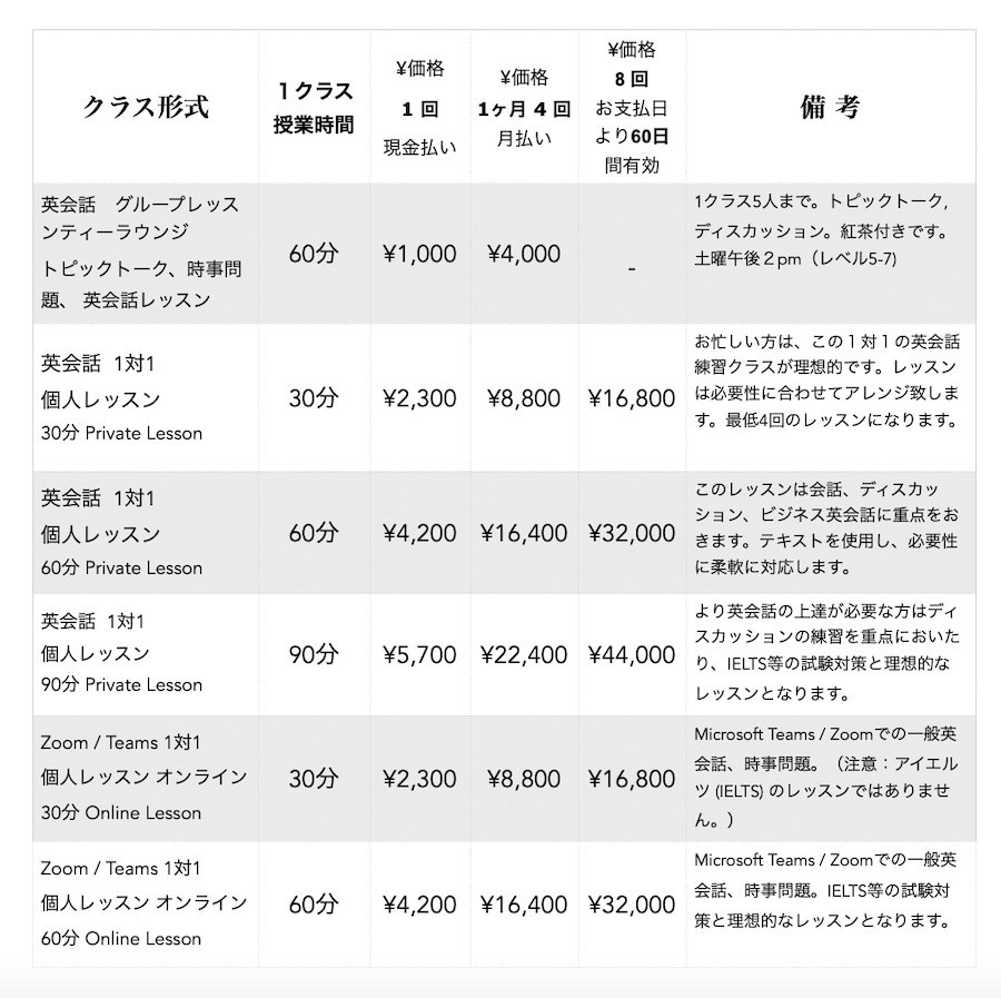個人レッスンには3種類あります。お忙しい方のため、1対1の30分レッスンは、プリント題材についての会話、お好みのトピックについてディスカッション致します。60分レッスンは、テキストを使ったり、ビジネス英会話などお好みに合わせてレッスン致します。90分レッスンは、会話の練習に重点をおきたい方に向いております。IELTSの筆記、会話、リーディングのスペシャリストです。エッセイの直しも行っております。